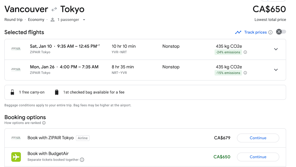 今年秋冬季有很多日期的往返票价低于 700 元 (但不包括 2025 年 12 月 4 日至 2026 年 1 月 4 日左右的圣诞新年假日季),因此避开繁忙假日季就能找到便宜的机票,例如 2026年1月10日星期六从温哥华机场出发,1月26日星期一从成田机场返回的航班,通过Budget Air 预订的往返机票的价格为650 元,直接通过Zipair 预订,票价略高一点,为679 元。
