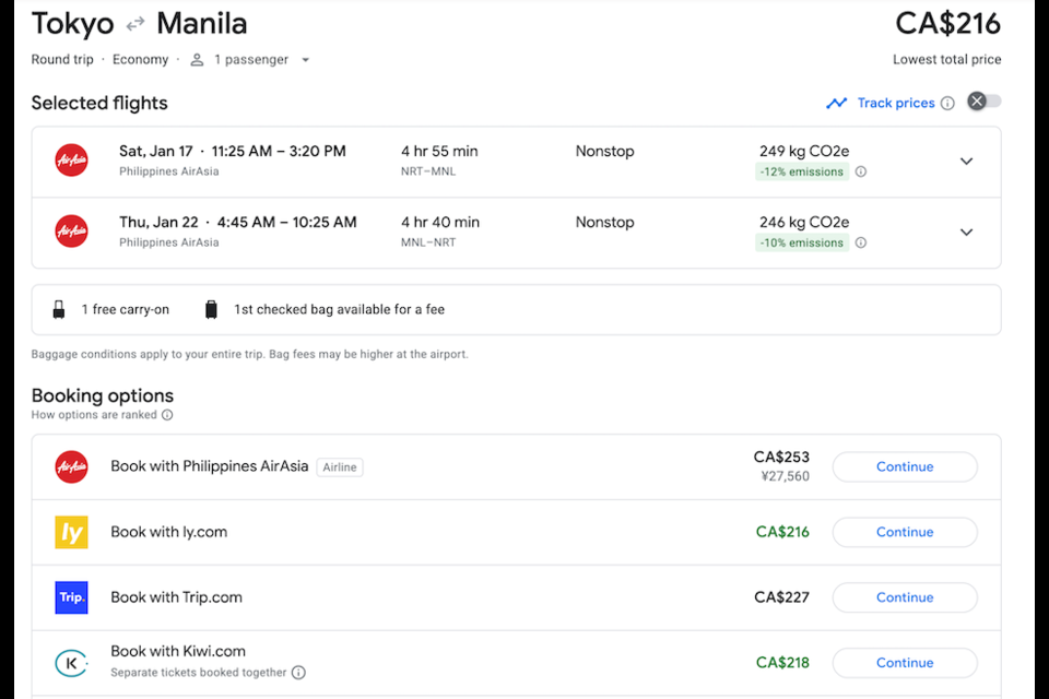两张机票的总价仅为 866 元(含所有税费),比单独购买飞往日本东京的机票+单独购买飞往菲律宾马尼拉的机票要便宜很多。