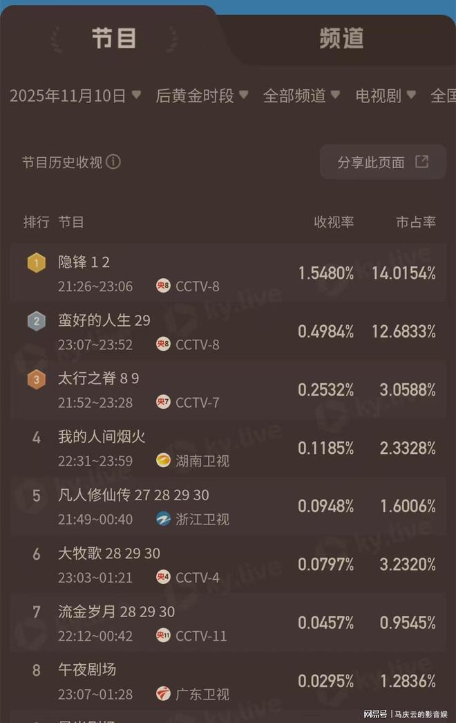 11月10日晚间次黄,电视剧《隐锋》在央八上星两集首播。这部电视剧由杜淳、颖儿主演,诸多戏骨级演员担任配角。尤其是观众们非常喜欢的任正斌老师,在该剧当中饰演沈主任这一角色。该剧开播之后,央八收视率直接处于同时段所有平台领跑状态。显然,这种看点明确的谍战剧,受众群体广泛且稳定。《隐锋》显然已经成为播出时段的热播电视剧作品了。