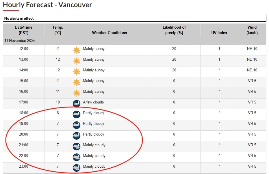 加拿大环境部天气预测,温哥华今晚开始有一些云层。也可能机会观看到极光。