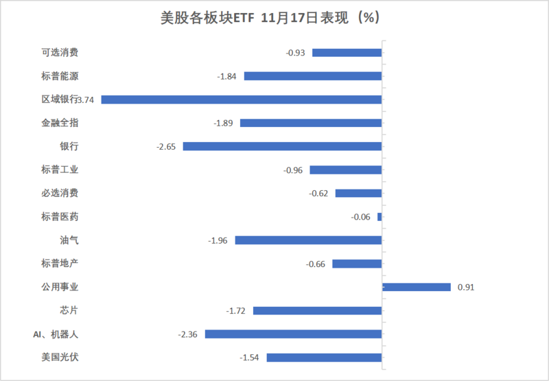 區域銀行ETF收跌超3.7%,和銀行業ETF領跌美股行業ETF,標普電信板塊漲超1.1%。