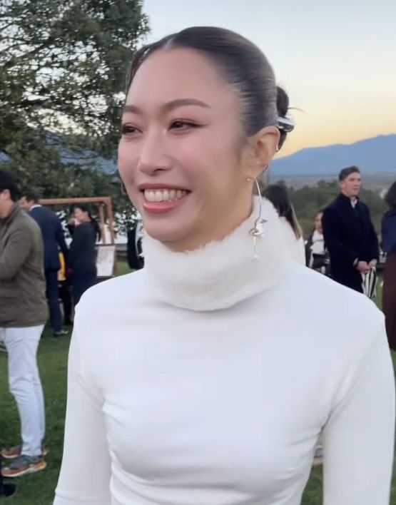 儀式結束後,戶外酒會緊接著開啟。午後的麗江氣溫漸涼,Namfon換上一條白色貼身長裙,領口和袖口的毛茸茸裝飾既保暖又增添了幾分可愛。她穿梭在賓客之間,與前來道賀的泰國好友熱情寒暄,時而舉杯暢飲,時而低頭淺笑,完全沒有豪門兒媳的拘謹。霍啟仁則始終陪伴在妻子身邊,不時為她整理裙擺、遞上飲品,兩人互動間的默契藏都藏不住。