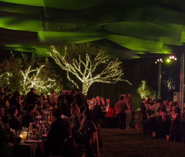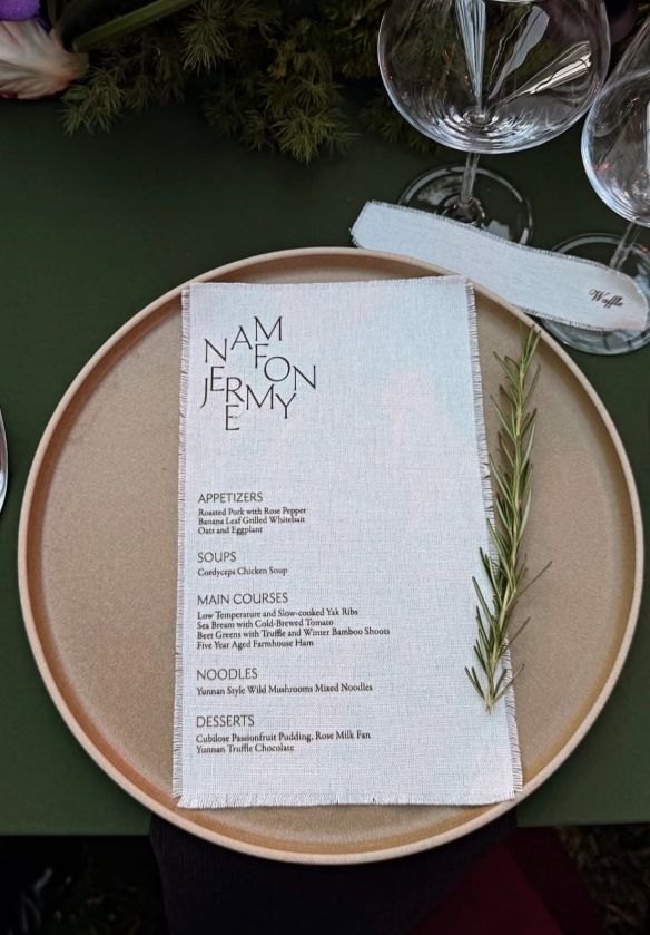當晚的室內晚宴以當地特色長桌宴為主,菜單精心挑選了麗江粑粑、臘排骨火鍋等特色美食,讓賓客品嘗到地道的雲南風味。晚宴上,Namfon再次換裝,一襲銀色吊帶晚禮裙勾勒出姣好身材,裙擺上的刺繡花紋在燈光下熠熠生輝。她與霍啟仁一起逐桌向親友敬酒,每到一桌都會用泰語和中文分別問候,情商頗高。