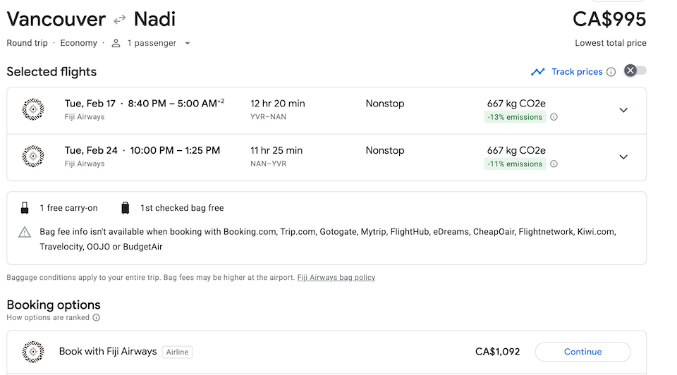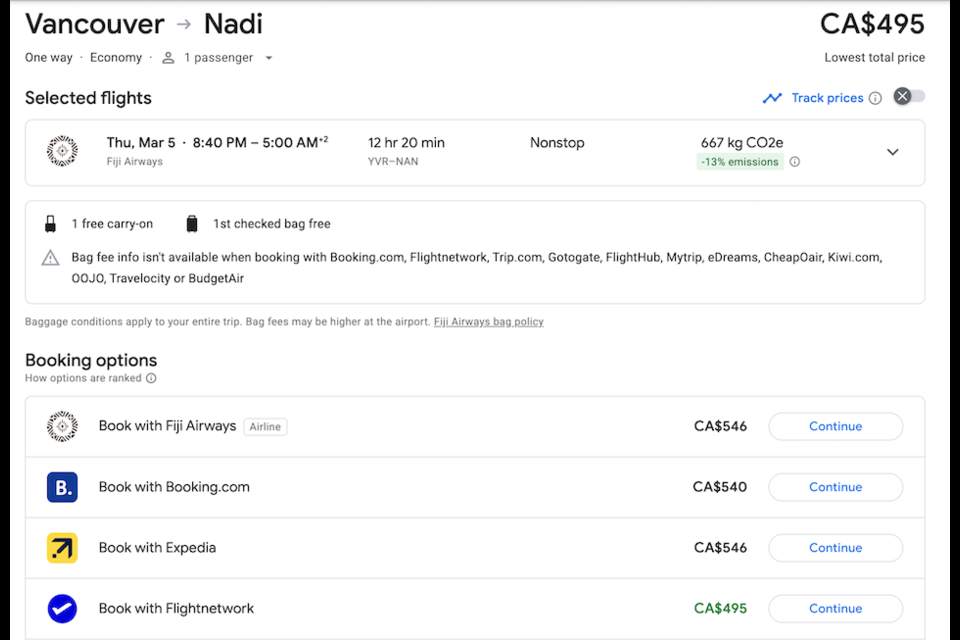 例如,2026年3月5日从温哥华出发的单程航班,通过第三方 FlightNetwork 预订的价格为495元。而直接通过斐济航空预订,则价格为546元,略贵一点。