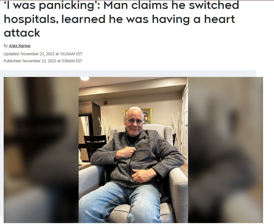 (加西网综合)加拿大一名男子讲述了他和死神擦肩而过的经历,他说去了医院急诊室却没有得到及时治疗,直到换了家医院才知道自己是非常严重的心肌梗塞,如果抢救不及时可导致死亡。