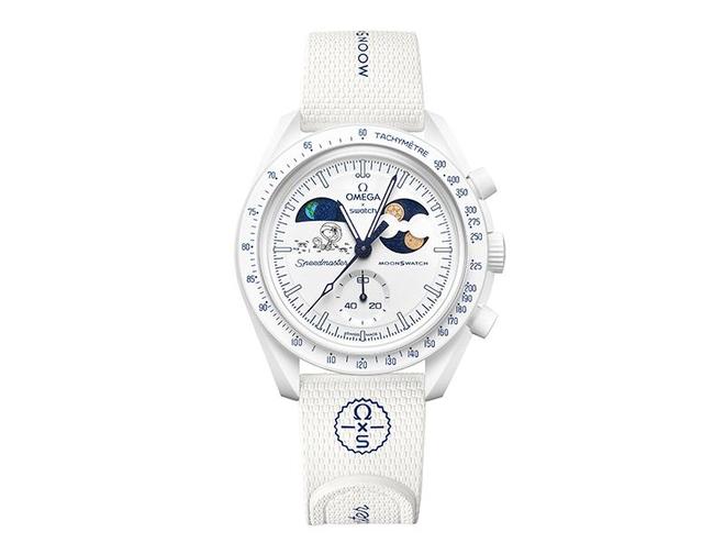 它延续了前代产品的表盘布局,有着欧米茄经典超霸系列月球表的各种特征,表冠上也有 OMEGA X Swatch 联名标志,以及灵感来自地球的电池盖设计。而在表盘上有史努比插画,有 Swatch 的地相指示器,也有饰有欧米茄 Moonshine 18K 金的月相指示器,并且每枚腕表的月相显示都镭射雕刻了专属的雪花图案,这呼应了自然界中的雪花都有独特的细节。