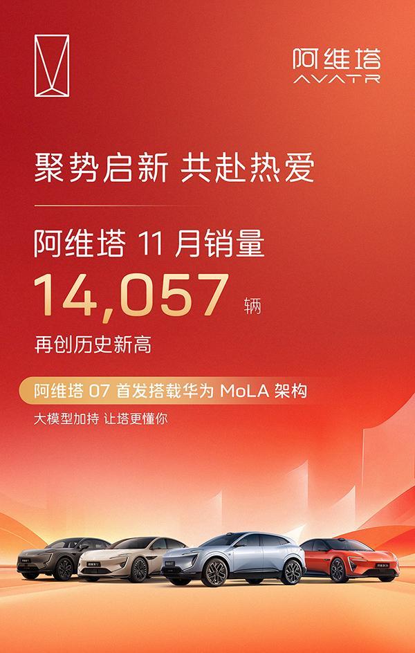 12 月 1 日,阿维塔公布了最新的销量数据:11 月阿维塔销量 14057 辆,同比增长 21%,再创历史新高,同时阿维塔已经连续 9 个月销量破万辆。