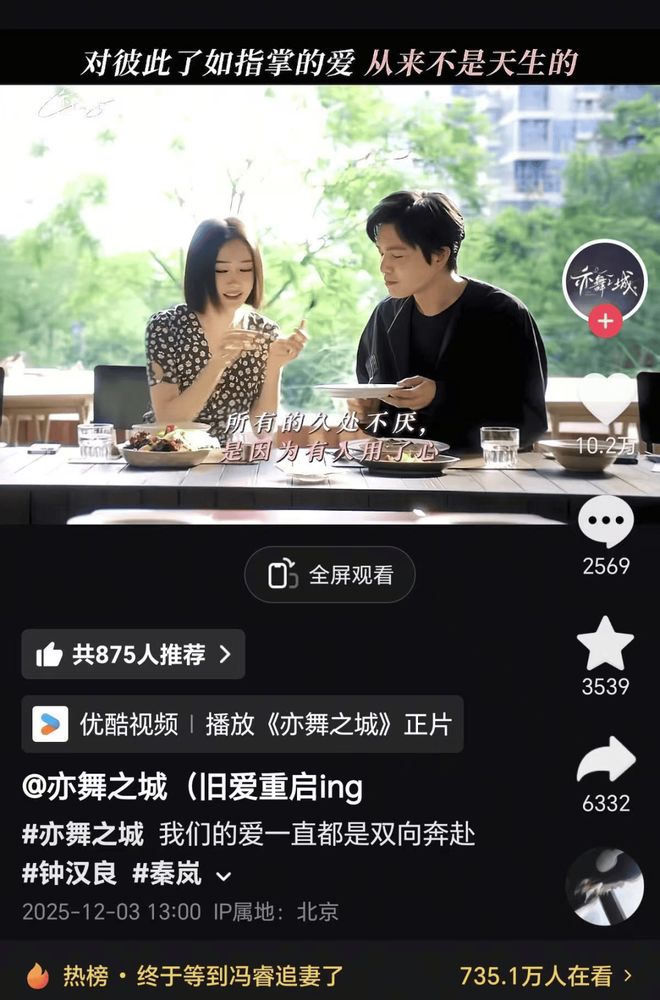 主打熟龄纯爱的《亦舞之城》又是另外一番风味,除了堪称中偶“天花板”的钟汉良与秦岚带来的CP化学反应,“豪门婆婆去母留子”“初恋现女友修罗场”等高能剧情名场面在开播前就在抖音释出并快速得到疯传。