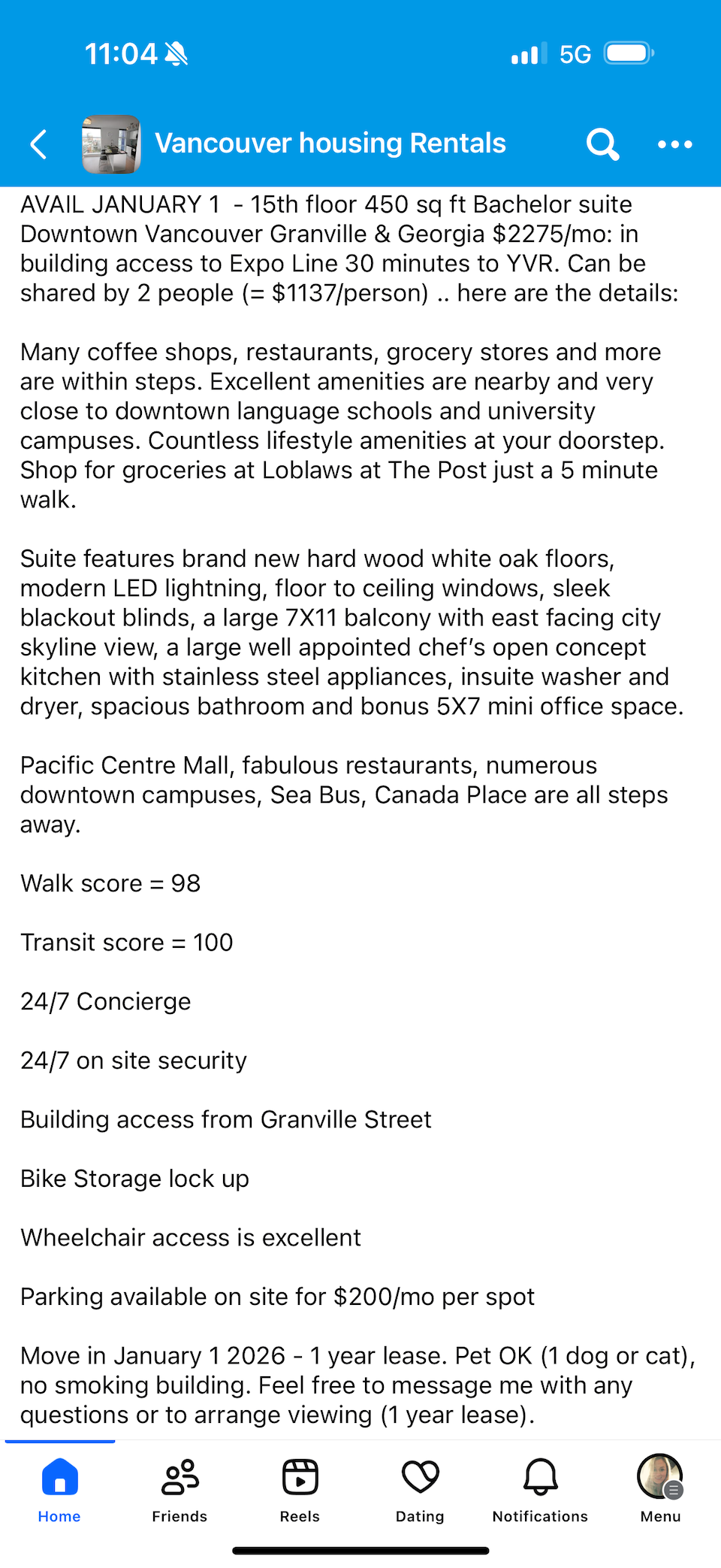 但根据最近发布在Facebook温哥华房屋租赁群组的一则房源信息,温哥华市中心一套450平方英尺(约42平方米)的单身公寓可供两人合租,月租金为2275加元。