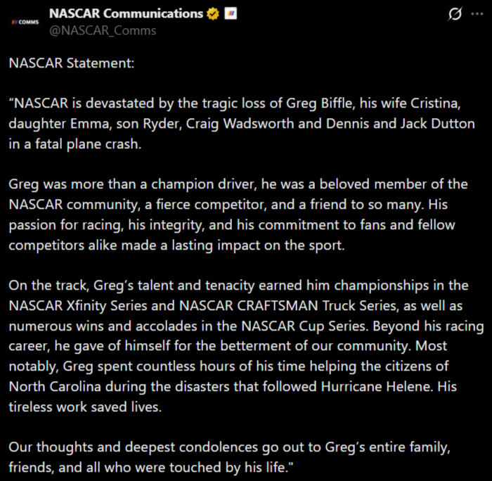 北卡罗来纳州警方称,前赛车手格雷格·比弗尔(Greg Biffle)及其家人在丧生的七人之中。