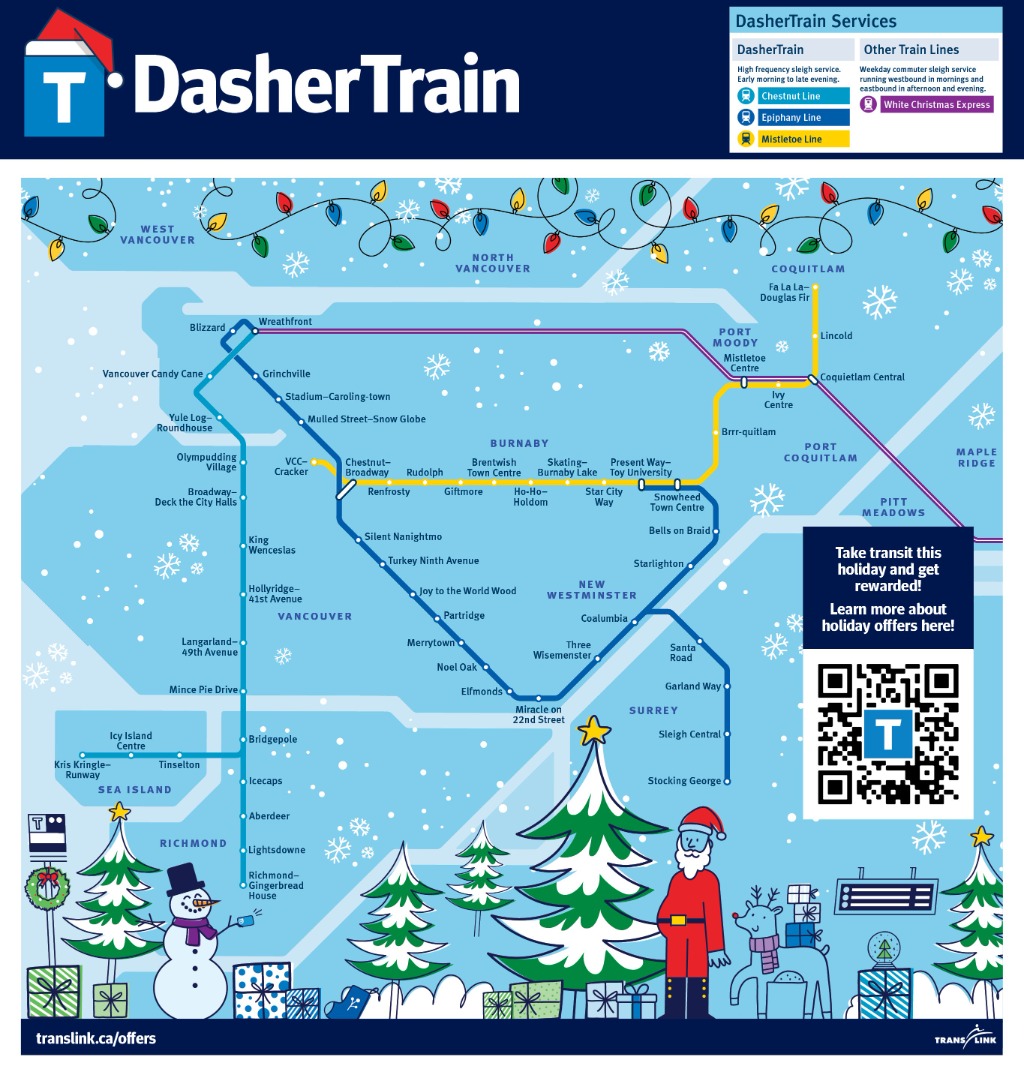 (加西网综合)圣诞老人可以让鲁道夫和他的伙伴们在圣诞节那天在大温地区“入站”稍微休息一下了,因为 大温运联(TransLink )又一次推出了天车(SkyTrain)圣诞节主题车站“DasherTrain”地图,并有新的车站加入。