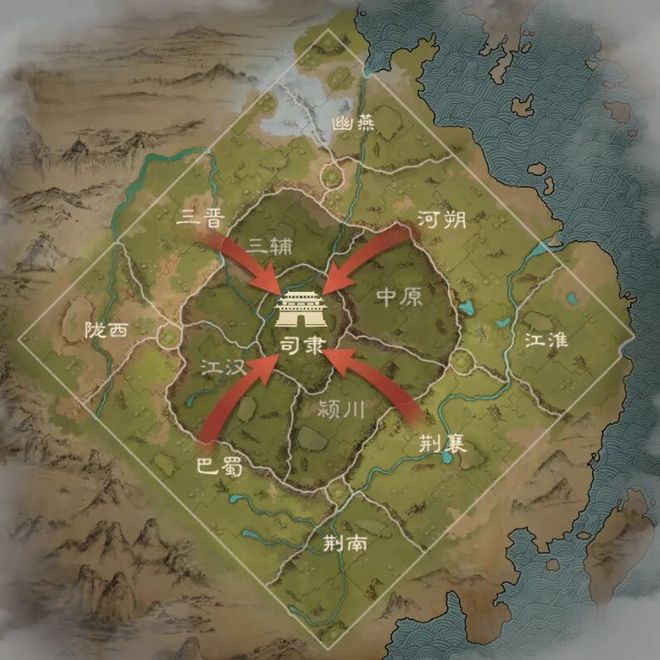 在这一点上,儒意景秀旗下的三国SLG《偃武》,就在这种“平衡之道”上做得可圈可点——作为强调PVP与公平性的多人在线SLG,《偃武》自然难以像光荣的“三国志”系列与CA《全面战争:三国》那样,还原完整且资源分布极不均匀的中国地图,而是必须将其设计为以司隶为中心,各州呈包围式分布的强公平性大地图。