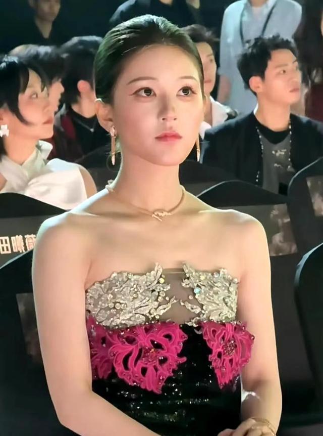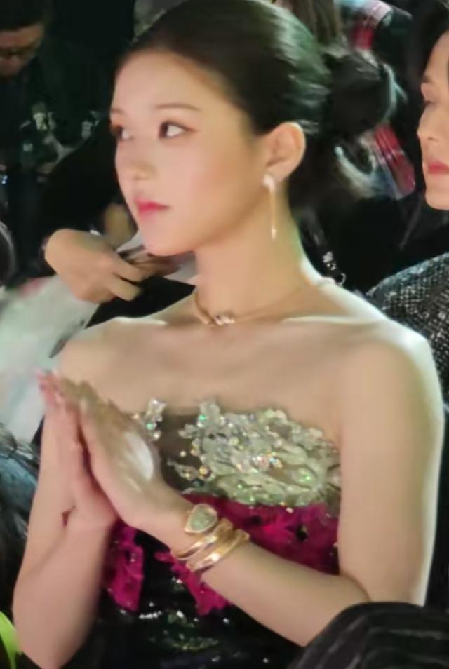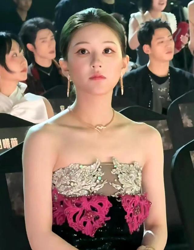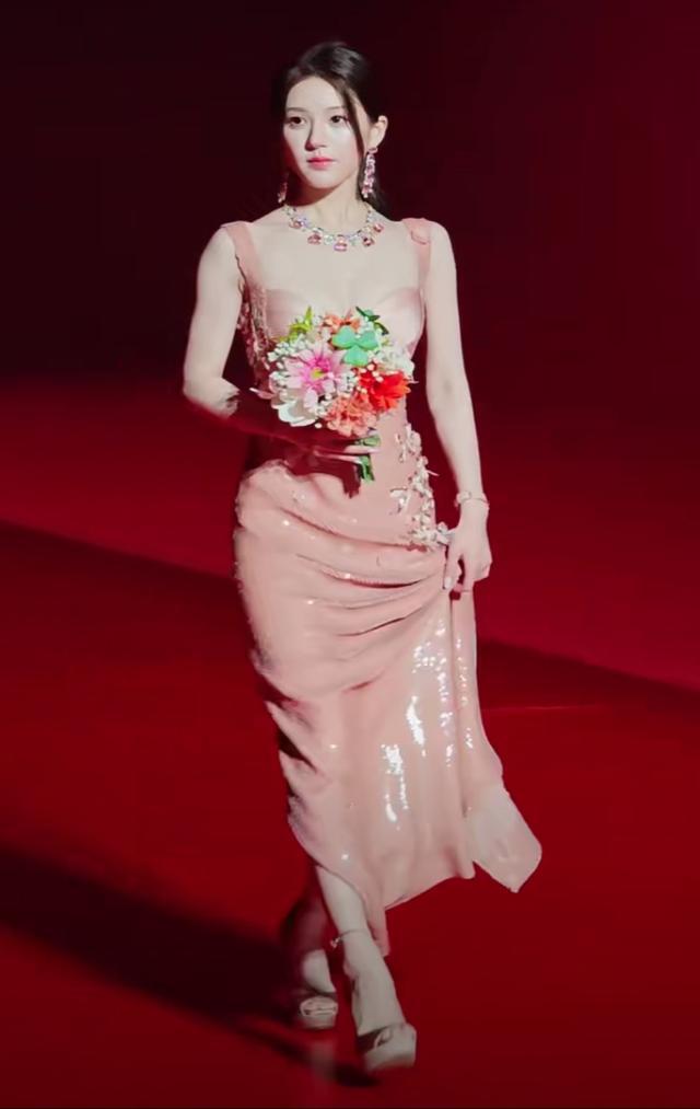 第1套造型是非常低胸的粉色抹胸裙,因為趙露思個子不太高,所以穿不出這一條裙子的婀娜多姿。