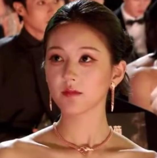 比起第1套造型,趙露思將全部頭發盤起來,露出了光滑的額頭,但是很好的顯露出了妝容的缺點。