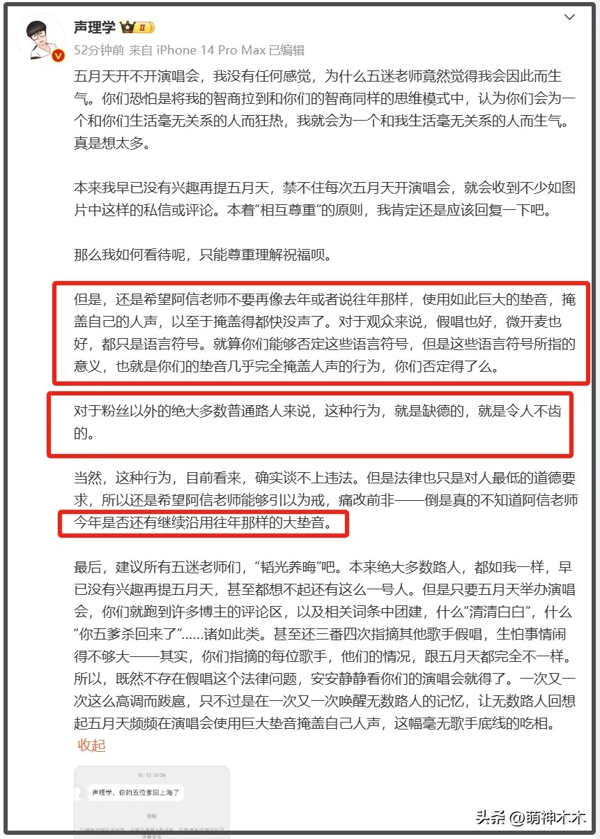 容我说句不好听的,他说五月天假唱也好、修音也好,都是个人水平和道德问题。