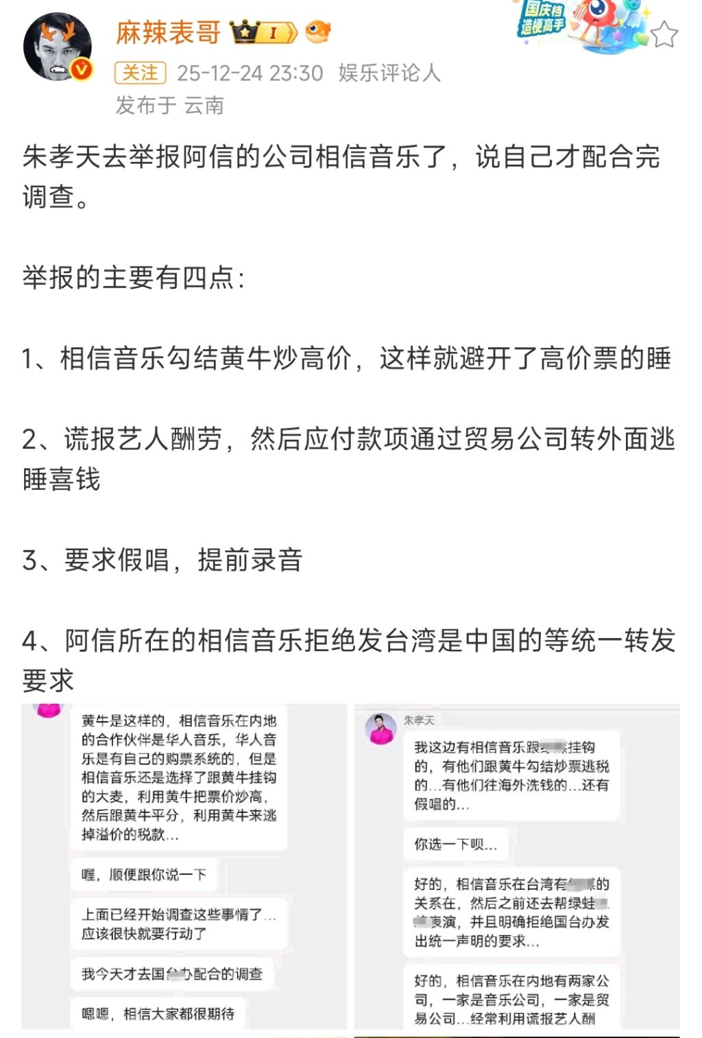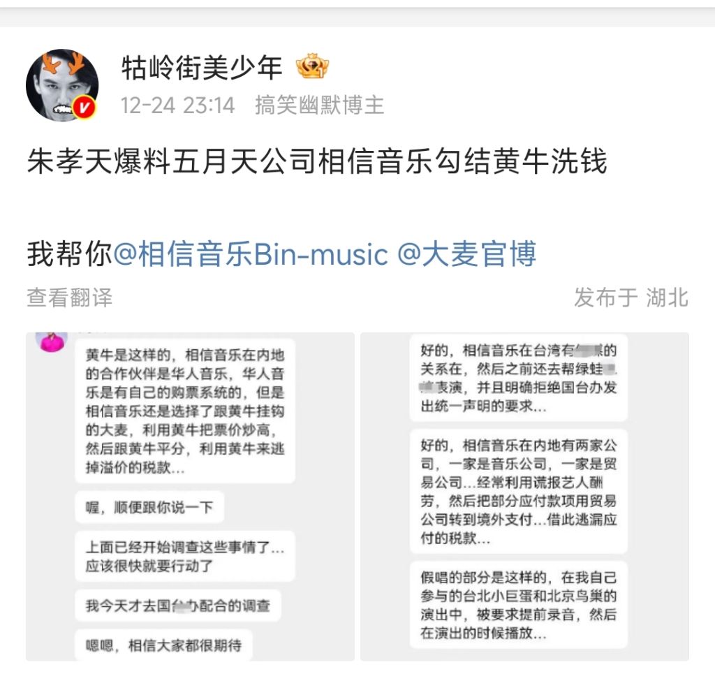 12月24日深夜,娱乐圈再爆大瓜。疑似知名演员兼歌手朱孝天在粉丝群里爆料,称五月天的公司相信音乐涉嫌勾结大麦平台洗钱,情节相当恶劣。