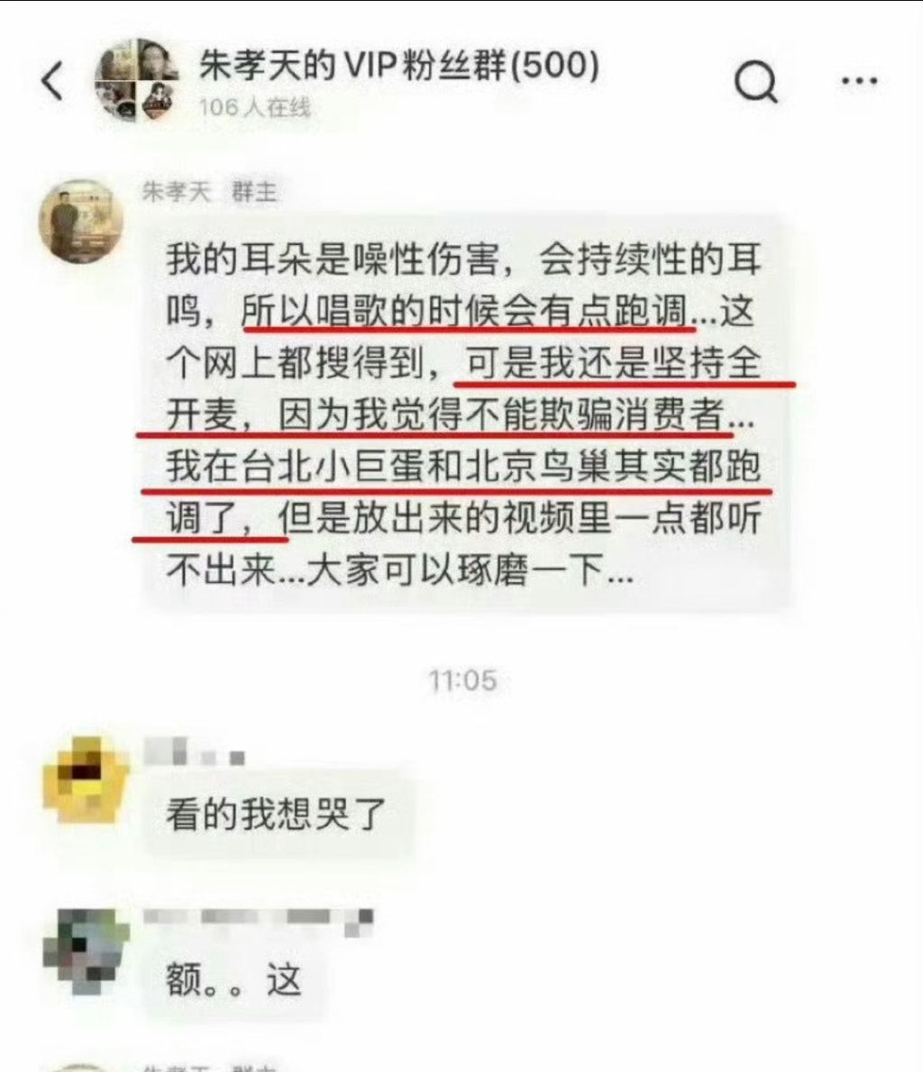 朱孝天向粉丝解释称,他的耳朵是噪性伤害,会持续性的耳鸣,所以唱歌的时候会有点跑调,可是他还是坚持全开麦,因为他觉得不能欺骗消费者。而在台北小巨蛋和北京鸟巢的两场合体演出,其实都有跑调,但是放出来的视频里一点都听不出来。朱孝天让大家琢磨一下原因。