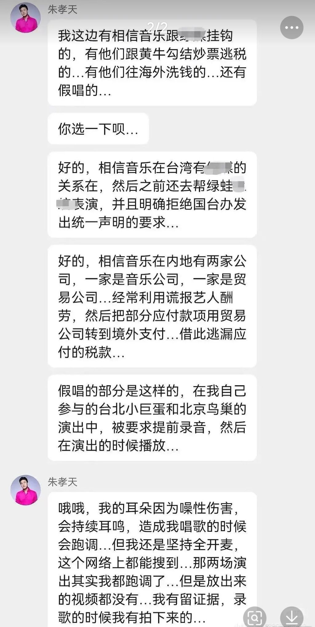 除了税务问题,朱孝天还曝光了相信音乐的另外一个操作。
