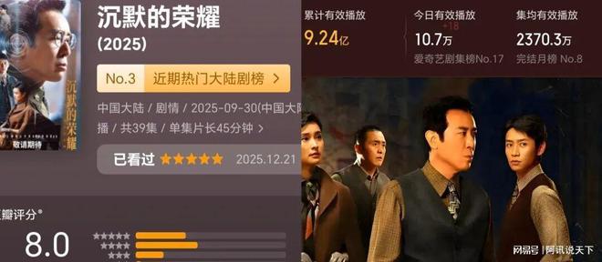 2025播放破亿国剧评分前十,杨紫陈晓在线,《沉默的荣耀》居冠