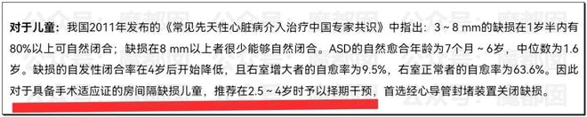這個專家共識同樣也寫得很明確,3~8mm的缺損,有80%以上可自然閉合,這也是手術主任著急做手術的原因,如果再不做,過1年半載很可能自愈了,另外,即使有手術適應證,也是推薦2.5~4歲進行手術。可悲的是,小洛熙是連最基本的手術指征也不具備。