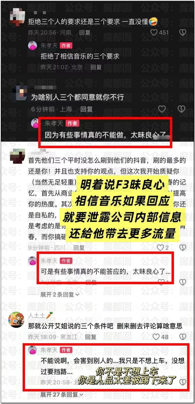 最後,朱孝天直接向“相信音樂”的相關負責人艾姐喊話,表示不理解對方為何采取“抹黑”和“潑臓水”的方式,而非直接溝通。他表明自己無意卷入罵戰,並希望對方在目的已達成的現狀下能“高抬貴手”,同時表示若未來有需要配合之處,他仍持開放態度。