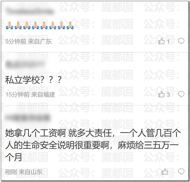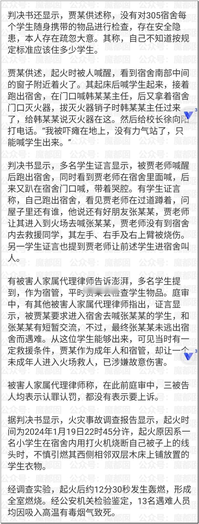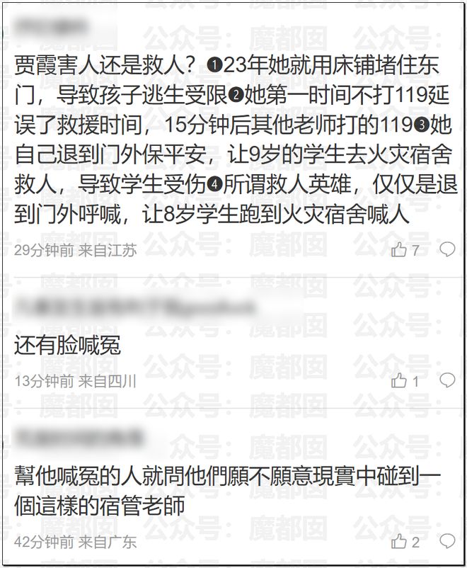 此外,她逃生後,安排一個9歲的學生的孩子回去救人,自己蹲在走廊裡,並沒有返回救人。這個9歲的學生被燒傷了…………