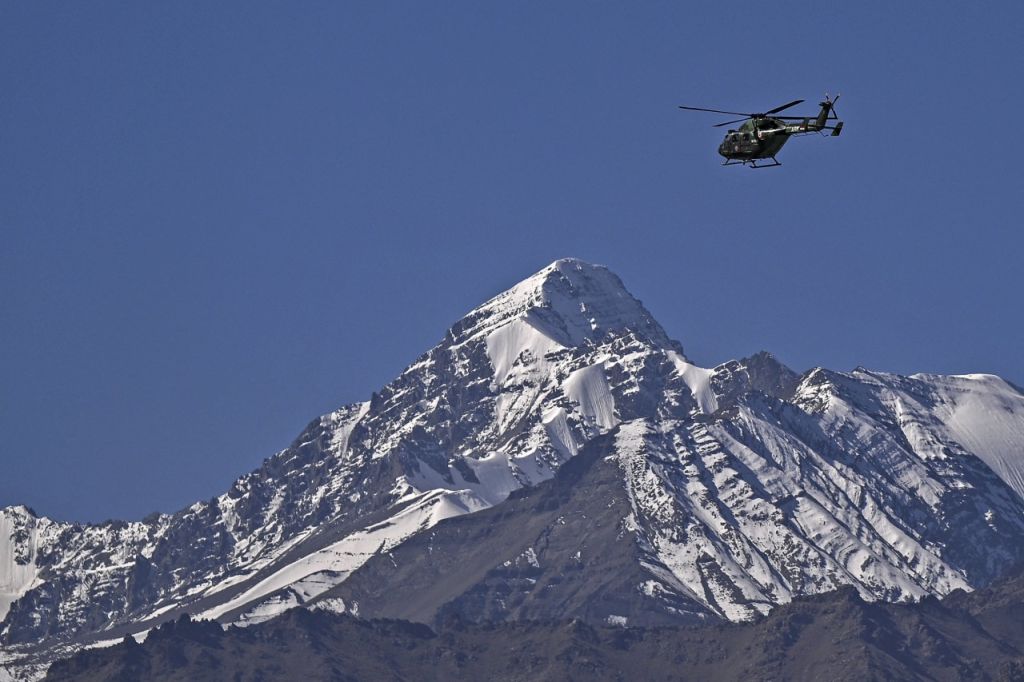 一架印度军用直升机在毗邻中印边境的拉达克地区上空盘旋。(Tauseef Mustafa/AFP/Getty Images)
