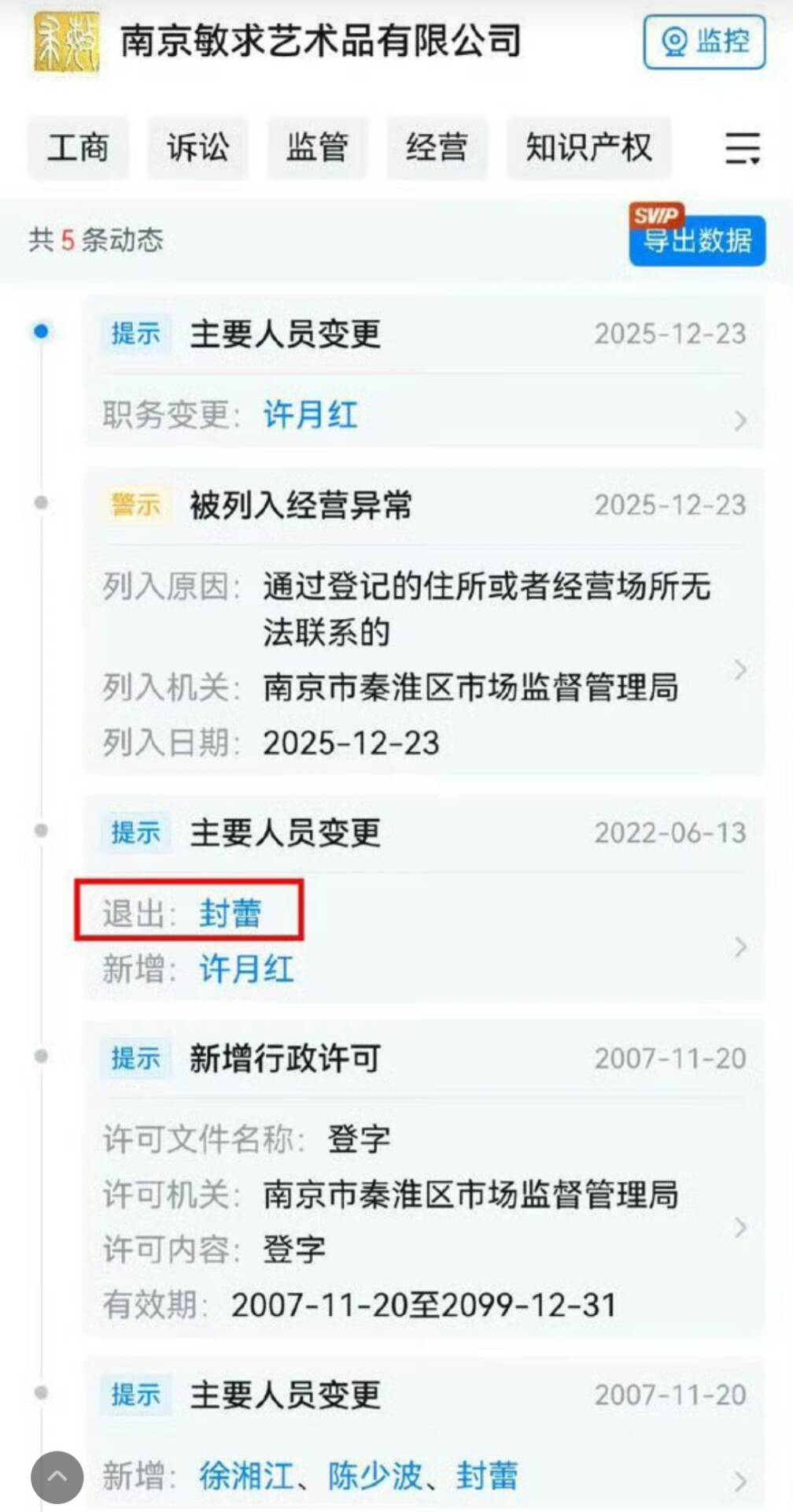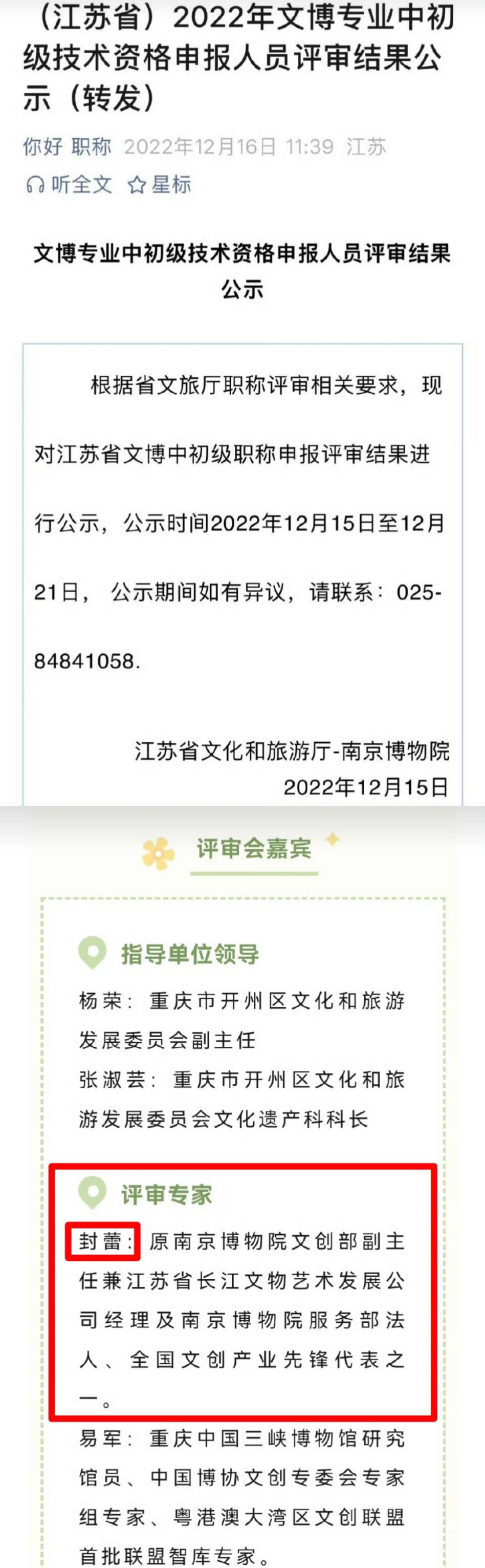 在这个文件里面显示,封蕾是南博文创部副主任及服务部的法人,还是长江文物艺术发展的公司经理。