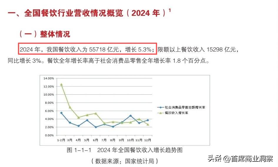 2024年国内的餐饮相关收入,已经达到了55718亿元,和2023年相比增长了5.3%。而2025年这个数据或许会突破6万亿。