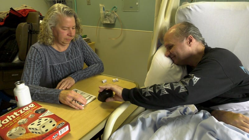2025年12月24日,肯·雷特科夫斯基在倫弗魯維多利亞醫院的病房裡和妹妹卡琳·雷特科夫斯基玩擲骰子游戲。(CTV新聞渥太華
