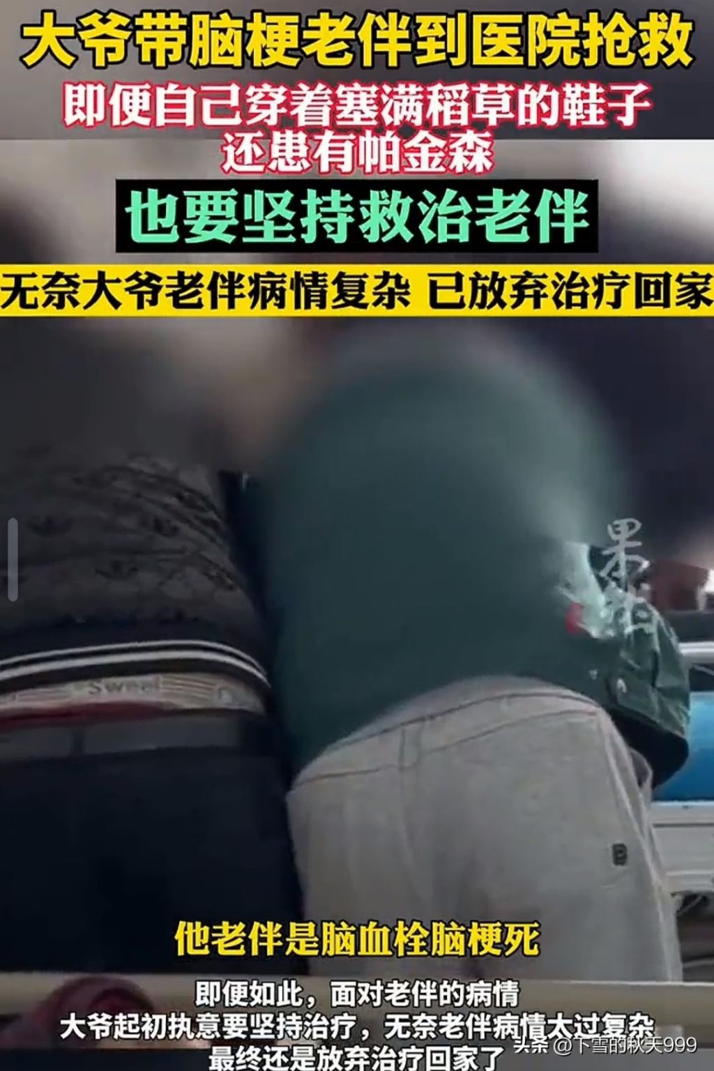 虽然大爷没有多少钱,但是他仍然坚持救治自己的老伴,医院里面的医生见他的老伴情况妙立刻展开了抢救,遗憾的是他的老伴病情复杂而且脑梗严重,最终医院劝大爷放弃治疗,大爷听到后泪如雨下,只好表示愿意将老伴带回了家,而他的儿子在接到母亲住院的消息后也很快就赶回了家,他给父亲买了新的鞋子,父子俩人悲痛的将母亲接回了家,陪着她度过生命的最后时光。