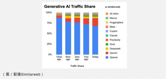 紧跟在 Gemini 身后的其他 AI 工具差距都在 1% 以内,第三名是同样也在今年窜起的 DeepSeek,从一年前完全没有入榜,现在已经吃下 3.9%,不过近期有衰退的趋势。反倒是马斯克所力推的 Grok 表现同样优异,也是一举获得 2.9% 市占,有望逐渐成长为第三势力。至于 Perplexity、Claude、Copilot 则与一年前相近。