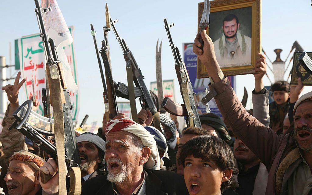 2025年11月30日,也门首都萨那,数千名胡塞武装支持者聚集庆祝独立纪念日,其中有人手持步枪,也有人拿着组织领导人胡塞(Abdul-Malik al-Houthi)的肖像。(Getty)