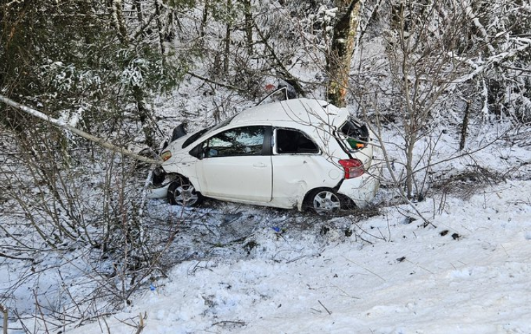 一辆白色丰田雅力士(Toyota Yaris)冲下路堤。