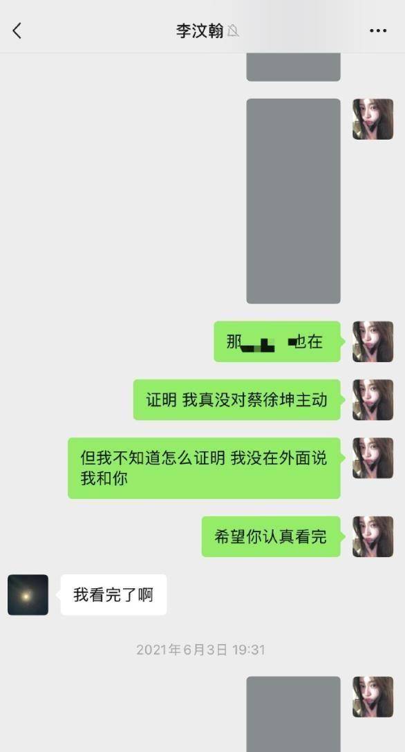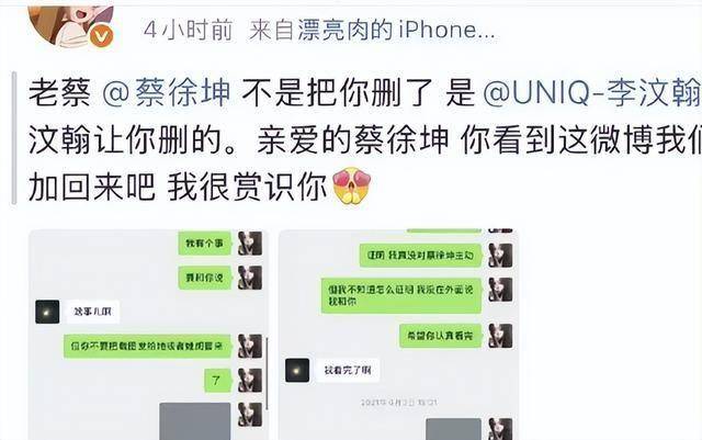 她还说,不是她主动删了蔡徐坤微信的,是李汶翰让删的,这个李汶翰就是司晓迪之前爆料的前男友。
