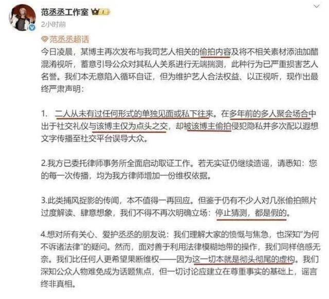 话里话外都是两人谈过一段姐弟恋,可范丞丞工作室很快回应,双方只是多人聚会时见过面,连单独往来都没有,更别说私下了,照片是被她偷拍后刻意误导大众。