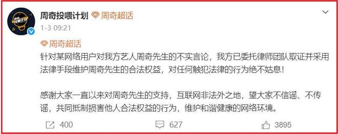 在司晓迪爆料之后,他的工作室发文称司晓迪关于他的言论是不实言论,周奇方面已经委托律师团队取证并采用法律手段维护周奇的合法权益。