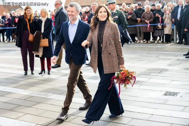 瑪麗王後也很喜歡穿西裝!職場女性很愛的格紋西裝外套,瑪麗王後也經常穿,她經常會搭配深色高領衫,下半身搭配闊腿褲,搭配長項鏈,特別襯膚色!
