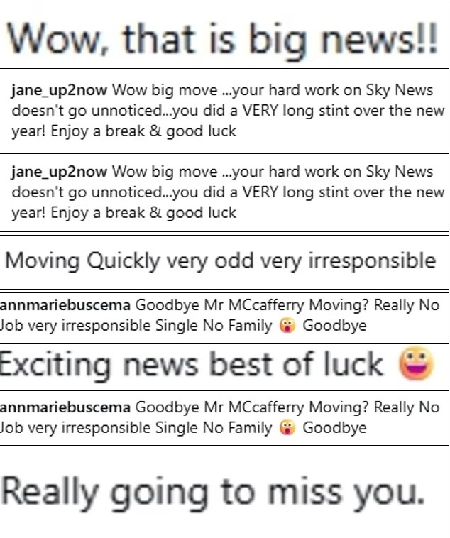 • “哇,大动作!你在 Sky News 的努力大家都看在眼里,祝好运!”