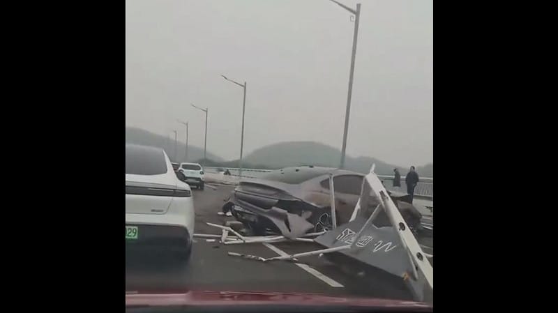 X 推主“李老师不是你老师”指出,10 月 17 日上午 7 点,位于湖北省武汉市的车谷大道公路发生了一起车祸事故,一辆小米SU7 在左前轮撞倒到路中央的护栏后,直冲对向车道,并与一辆货车发生碰撞。随后,该辆 SU7 的左前轮车轴断裂,轮胎独自耸立在车祸现场约 10 米外的道路上。