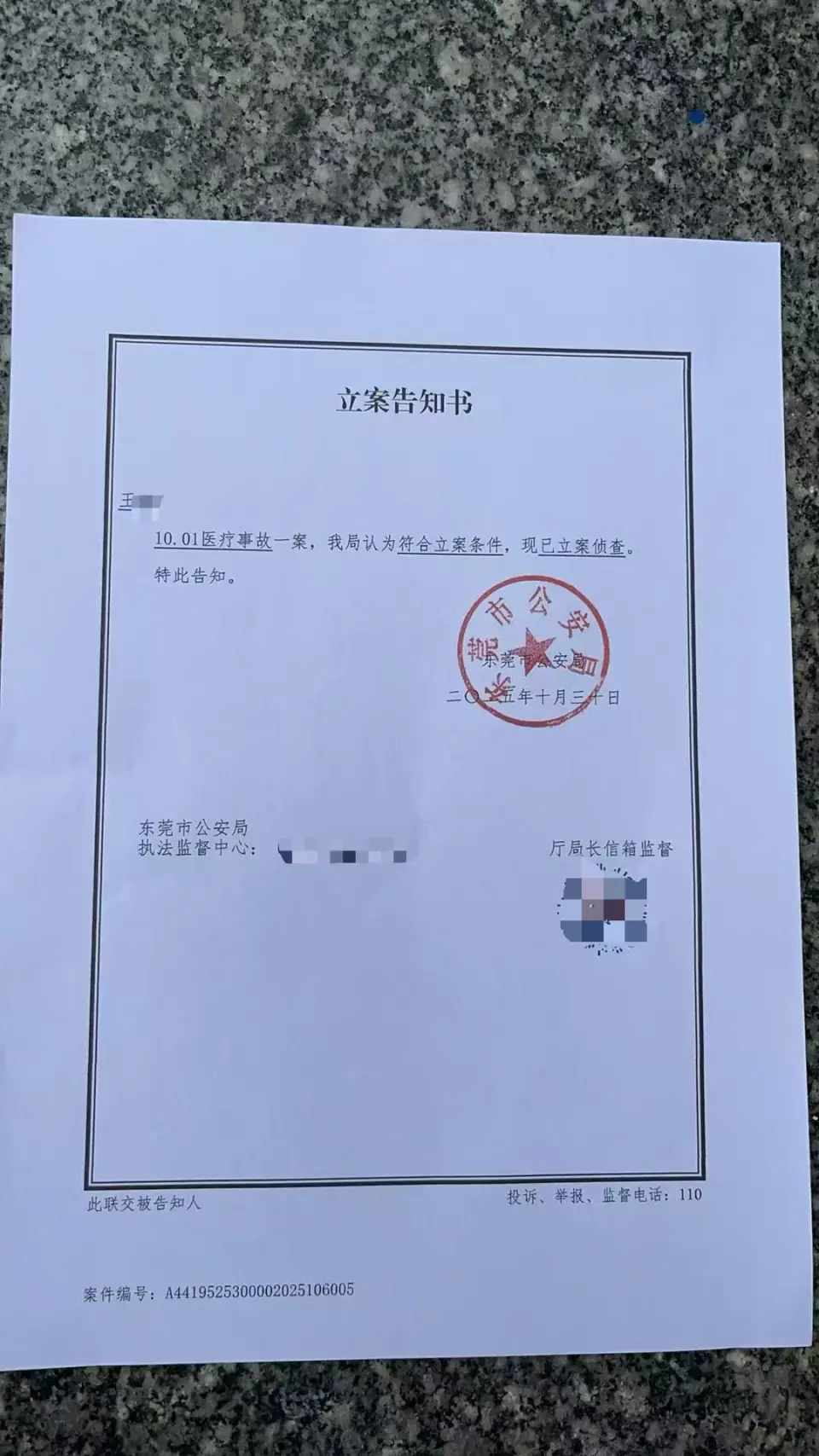 2025年10月1日,王女士向东莞市公安局南城分局报警。10月30日,警方就“医疗事故”一案,立案侦查。