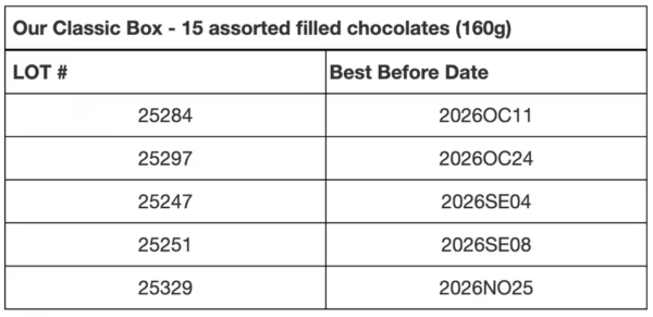 受影响的巧克力礼盒的生产批次包括: