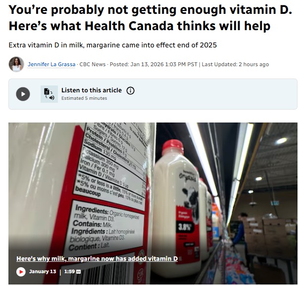 根據CBC的報道,西安大略大學(Western University)營養科學教授布倫達·哈特曼(Brenda Hartman)指出:“我們生活在加拿大,冬季太陽光不足,維生素D的合成非常有限”。