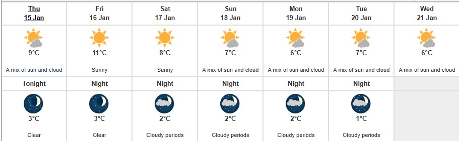 今天:多云,接近中午时转为晴间多云。早晨的雾段逐渐消散。最高气温 9°C。紫外线指数 1(低)。