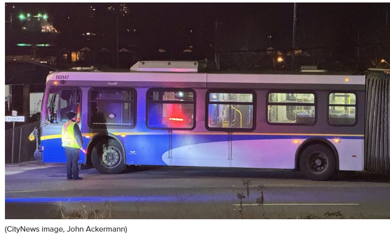城市新闻获得的周四晚间拍摄的画面显示,警方在现场拦停了一辆铰接式的 TransLink 公交车。