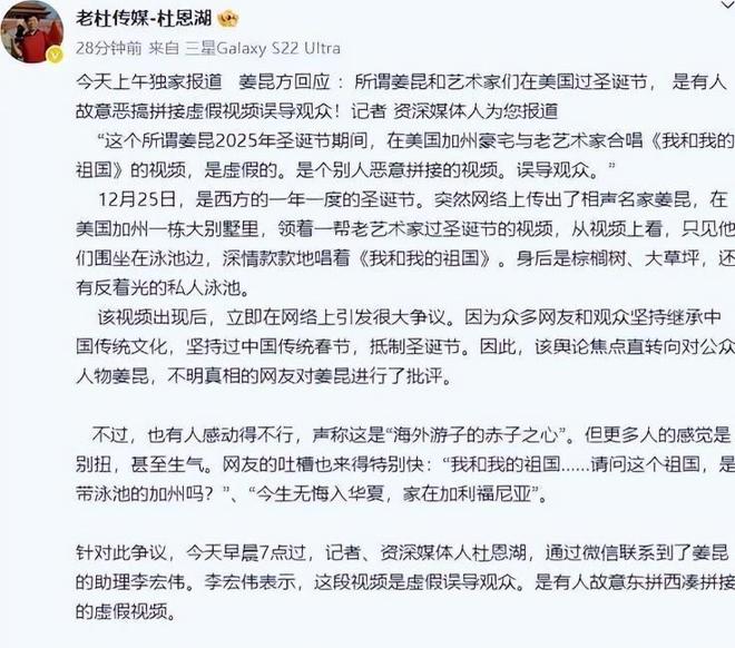 更详细的真相随后浮出水面。视频的原始拍摄者迟云详细说明了视频的真实背景:2025年12月19日,已故医学专家徐荣祥的遗孀李俐准备前往澳门参加国际电影节,她监制的传记电影《再生密码》入围了奖项。 一群老朋友在徐荣祥北京的家中为她饯行,现场气氛感人,大家即兴唱起了《我和我的祖国》。 这段温馨的送行画面被恶意篡改:从12月21日起,有人将视频下载后重新编辑,添加了“美国加州”、“圣诞节聚会”等虚假标签。