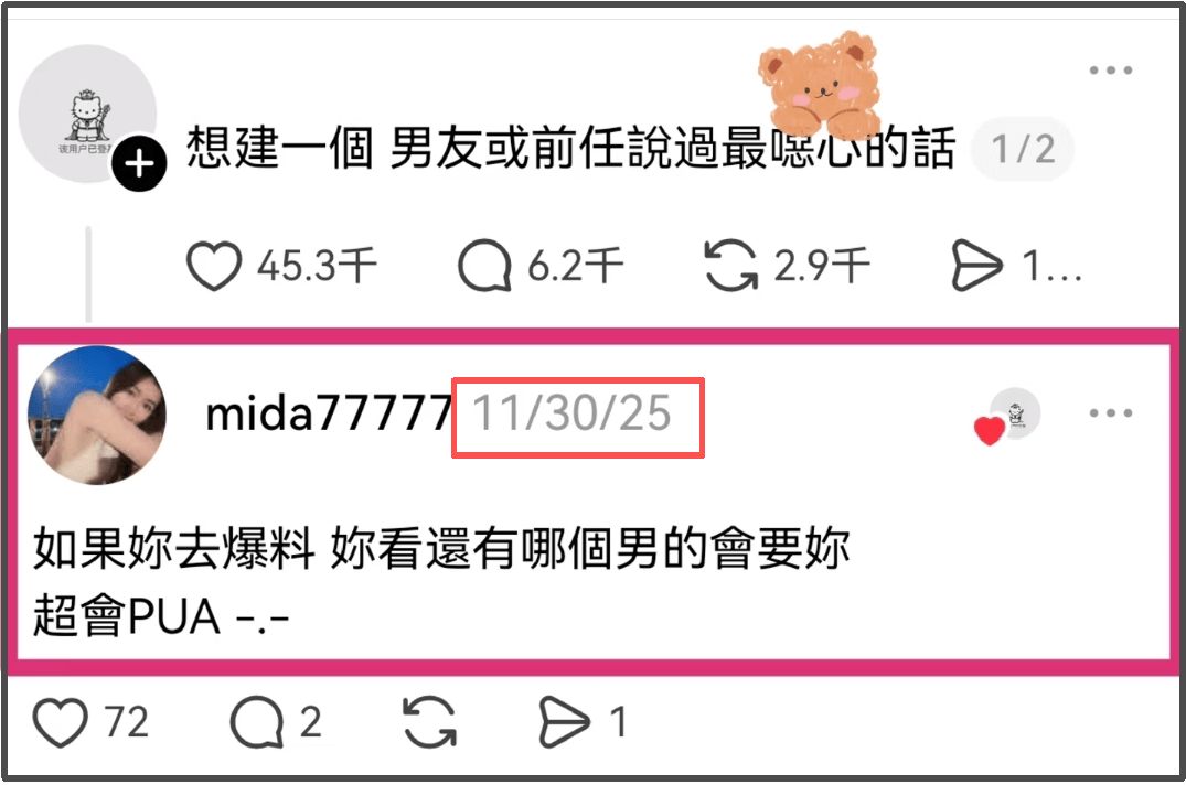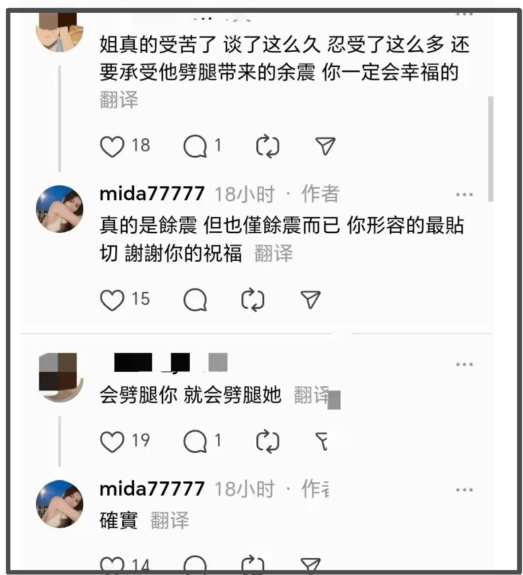 順著mida的社媒發言,還能看到她去年11月底的吐槽,表示前任說過最惡心的話是“如果你去爆料,你看還有哪個男的會要你,超會pua”,從交往時間線來看,基本上就是吐槽林俊傑了,不然她不會默默隱身好幾年。清醒回頭看,這句話不僅是威脅,還有嚴重的男凝,把女性價值建立在男性需求上。