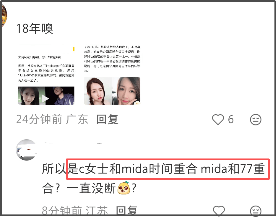 林俊傑與前女友mida合影曝光的過程相當滑稽,此前林俊傑官宣與七七戀情,mida隔空內涵林俊傑是劈腿仔,林俊傑粉絲在其評論區怒斥沒證據是胡編亂造,mida就表示可以私信證據希望對方能道歉。之後,這位粉絲許是看到了證據,便在mida的評論區認真道歉,且反省了自己的不當措辭和激烈情緒。
