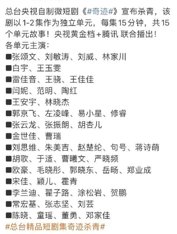 前不久,多位明星发出消息,带“总台精品短剧集奇迹杀青”,看到这样的消息,大家才反应过来,原来短剧集《奇迹》杀青了,这部剧将围绕“奇迹”概念,多层次地全方位展示深圳这座奇迹之城,45年来波澜壮阔的发展画卷,以及未来的无限可能,我们将通过剧中鲜活的人物,共同了解城市的发展轨迹。