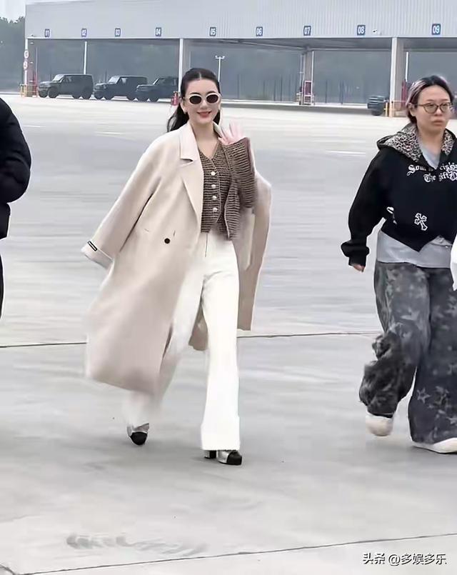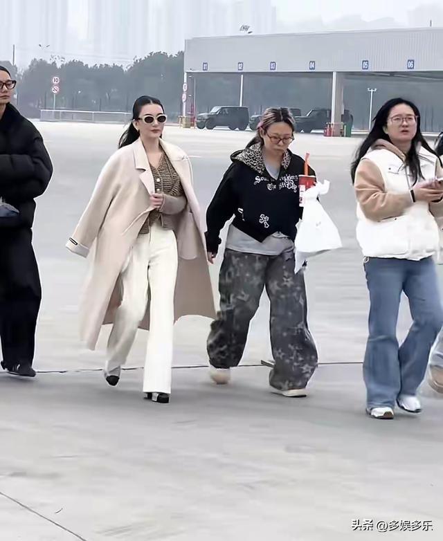 路人镜头下的她,为了弥补身高短板,踩了一双目测15厘米的厚底高跟鞋,长裤子遮住了大半鞋跟,可走起路来依旧显得笨重,丝毫没有往日的轻盈。一身宽松白色裤子虽刻意藏肉,却还是遮不住产后变宽的腰胯,走路时双腿难以并拢的细节,暴露了还没完全恢复的体态。